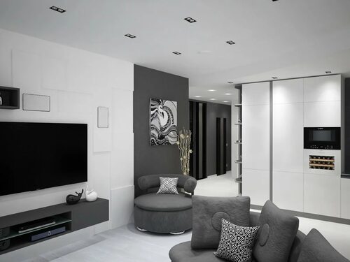 Черно-белый интерьер гостиной может быть украшен графичными элементами, такими как абстрактные рисунки, геометрические узоры или контрастные текстуры. Это придает помещению современный и стильный вид.