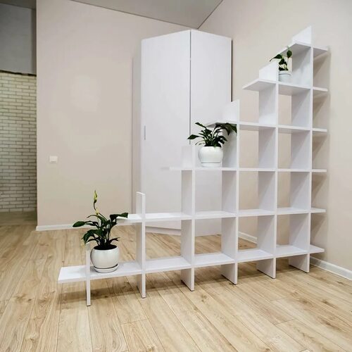 Перегородка в виде стеллажа позволяет эффективно использовать вертикальное пространство, особенно в небольших помещениях. Она может служить не только разделительной структурой, но и функциональным элементом, на котором можно разместить книги, декоративные предметы, посуду, растения и многое другое.