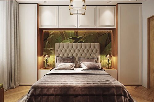 Спальня со шкафами по бокам кровати