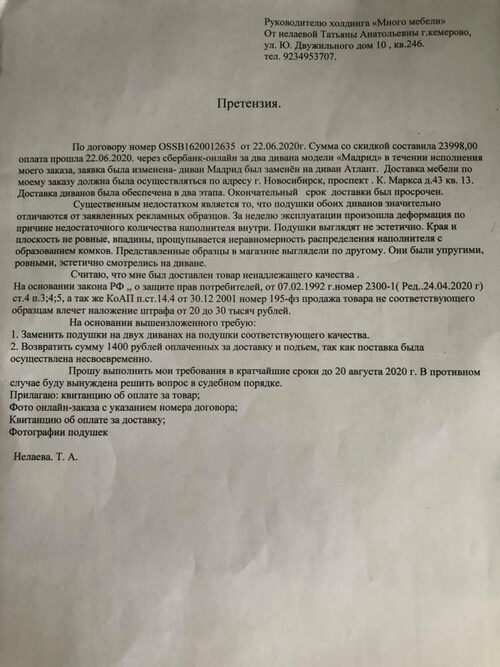 Я, [Ваше имя], приобрел(а) у вас мебель (указать наименование и описание мебели) [Укажите дату приобретения], и хотел(а) бы обратить ваше внимание на следующие недостатки и ненадлежащее качество данной мебели: