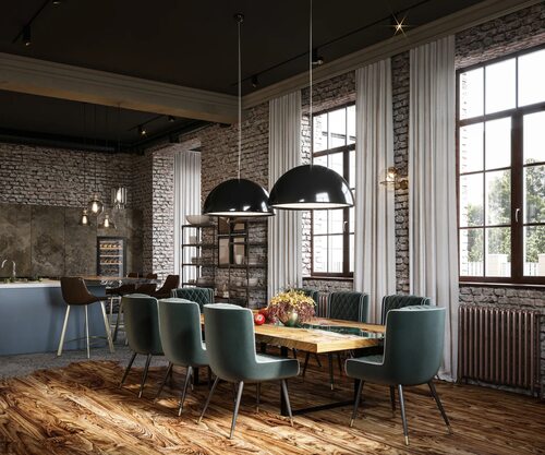 Одной из ключевых особенностей интерьера в стиле лофт является использование промышленных элементов. Открытые трубы, металлические конструкции, стекло и бетон - все это придает интерьеру современный и неординарный вид. Кроме того, интерьер столовой в стиле лофт часто дополняется мебелью из натуральных материалов, таких как дерево и кожа, создавая гармоничное сочетание с промышленными элементами.