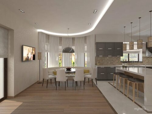 Здесь будет описание идей дизайна гостиной с эркером и кухней, включая использование различных материалов, мебели, освещения и декора для создания гармоничного интерьера.