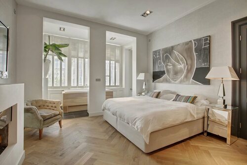 Дизайн спальни с использованием паркета \"елочка\" может придать интерьеру уют и оригинальность. Этот уникальный вид паркетной доски создает впечатление рисунка елочки, что добавляет интереса и стиля помещению.