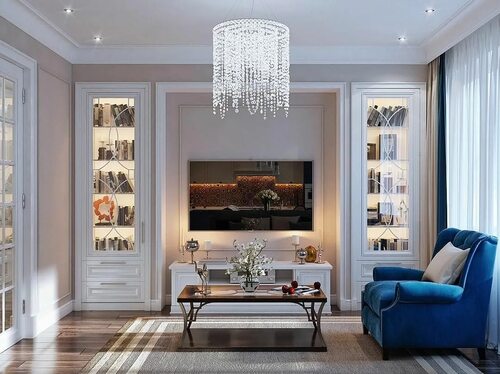 Витрины в классическом стиле могут стать центральным элементом гостиной, придавая ей изысканность и роскошь. Они могут быть украшены шелковыми занавесками или дополнены встроенным освещением, чтобы подчеркнуть красоту выставленных предметов.
