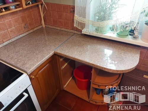 После удаления старой столешницы, измерьте размеры новой столешницы из ДСП и отметьте необходимые точки для подгонки. Фотография 2: Измерение новой столешницы.