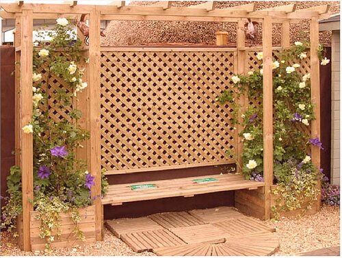 12. [Фото деревянной перголы с растениями и скамейкой]
