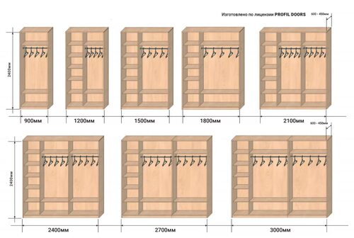 Ниже приведены фотографии различных вариантов шкафов-купе с разной шириной дверей для наглядного примера.