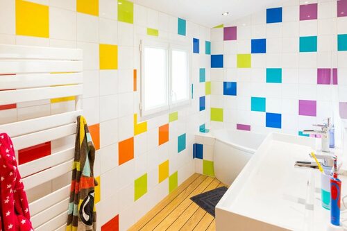 Яркие идеи для дизайна ванной с разноцветной плиткой
