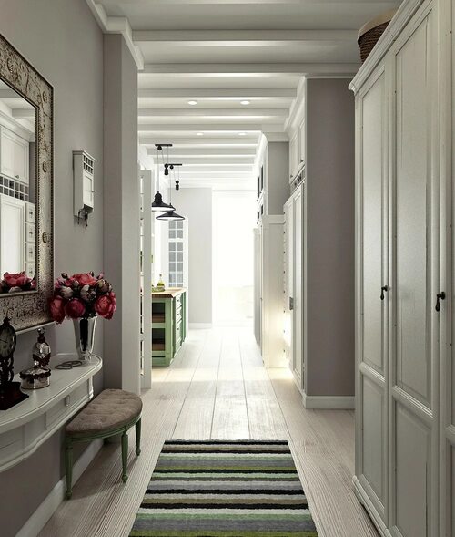 При выборе мебели и декора для длинного широкого коридора важно учитывать его функциональность. Здесь можно использовать консоли, комоды, зеркала и другие элементы, которые не только украсят пространство, но и будут выполнять практическую функцию.
