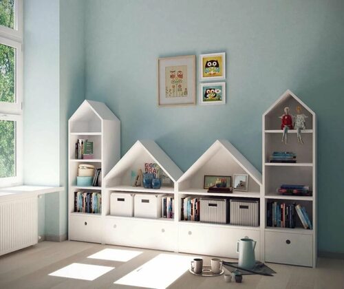 Стеллаж в виде домика может быть использован для хранения игрушек, книг, одежды и других предметов, необходимых в детской комнате. Благодаря своей необычной форме он станет не только функциональным элементом, но и декоративным акцентом.