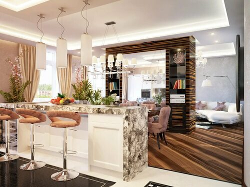 Для любителей традиционного дизайна подойдет интерьер кухни с барной стойкой и гостиной в классическом стиле. Приглушенные оттенки, изысканная мебель и декор создают атмосферу уюта и изыска.