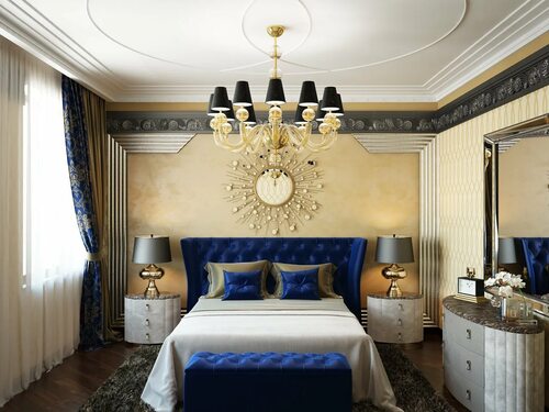 При создании дизайна спальни в стиле ампир особое внимание уделяется выбору мебели и отделки. Характерными чертами этого стиля являются массивные кровати с изящными изголовьями, изысканные тумбы и комоды, а также обилие декоративных элементов, таких как резные узоры, золочение и кристаллы. Для отделки стен и потолка часто используются обои с барочными узорами или фрески, создающие атмосферу роскоши и изыска.