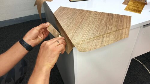 Аккуратно прижмите шпон к мебельной поверхности, начиная с одного края и постепенно продвигаясь к другому. Убедитесь, что шпон ровно ложится и не образует складок.