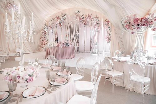Оформление свадебного зала в пастельных тонах придает торжеству особую нежность и романтику. Пастельные оттенки, такие как бледно-розовый, светло-голубой, персиковый и лавандовый, создают атмосферу нежности и уюта.