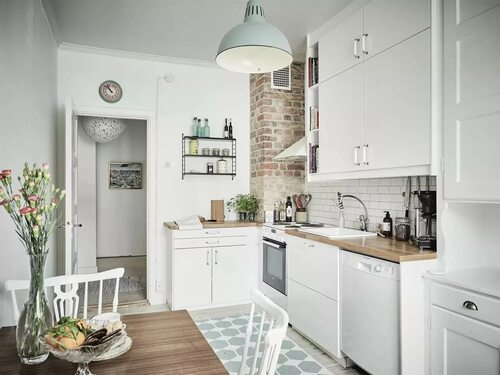 В скандинавском стиле также часто используются натуральные материалы, такие как дерево и камень. В маленькой кухне можно использовать деревянные элементы для создания теплой и уютной атмосферы, при этом сохраняя чистоту линий и минималистичный вид.