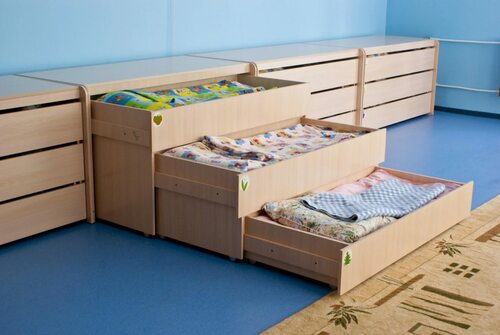 Раздвижные кровати позволяют эффективно использовать пространство в детском саду, так как их можно легко складывать и раскладывать в зависимости от потребностей. Кроме того, такие кровати обычно оборудованы колесиками, что облегчает их перемещение и уборку помещения.