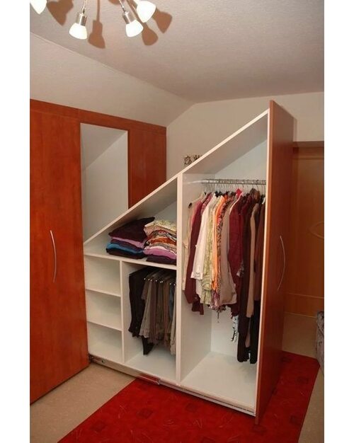 Шкафы выкатные являются отличным решением для использования пространства на мансарде. Они позволяют эффективно организовать хранение в условиях ограниченной площади и необычной формы помещения.