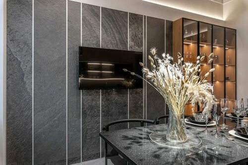 Каменный шпон можно использовать как для облицовки всей стены, так и для создания акцентных элементов. Он отлично подходит для создания фактурных поверхностей, которые привлекают внимание и придают интерьеру особый шарм.