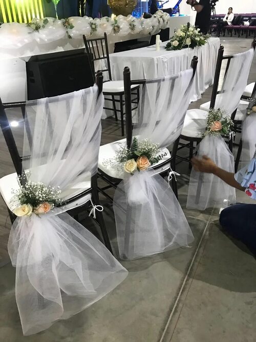 2. Фатиновые обвязки. Другой вариант - обвязать спинку стула фатиновой тканью, создавая нежный и изысканный акцент.