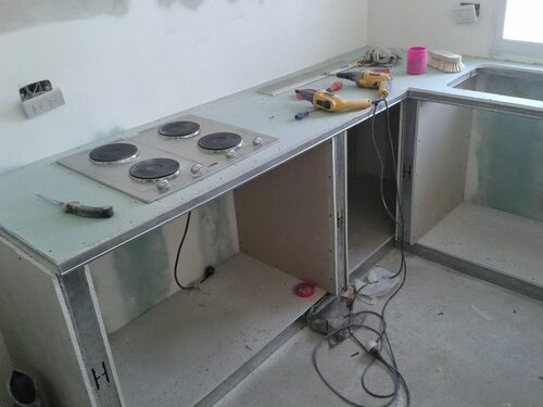 Проведите измерения кухонного пространства, где будет установлена столешница, и нарежьте гипсокартон согласно полученным размерам. Обратите внимание на точность измерений, так как от этого зависит итоговый результат.