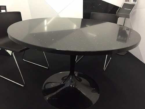 Черный цвет обеденного стола из искусственного камня придает ему роскошный и современный вид. Этот стол может стать центральным элементом вашей столовой или кухни, добавляя шик и элегантность.