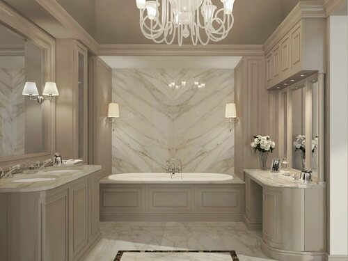 Ванная комната в стиле современная классика отличается использованием натуральных материалов, таких как мрамор, стекло, дерево. Также характерными элементами являются изящные формы и линии, декоративные элементы, такие как карнизы, молдинги и колонны, а также изысканные светильники и аксессуары.