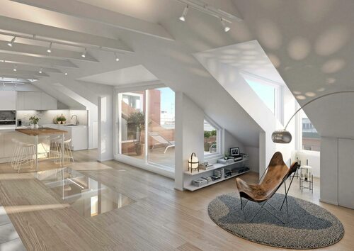 3. Светлые оттенки и хорошая освещенность делают интерьер мансарды визуально просторным и светлым.