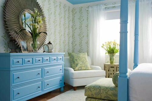 Сочетание голубых обоев с белым цветом