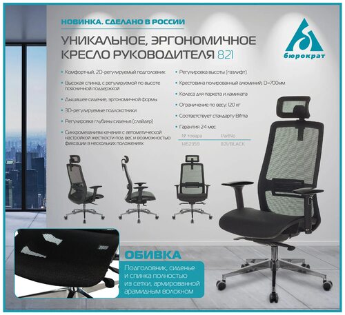 Кресло руководителя бюрократ 821 оснащено удобными подлокотниками, регулируемой высотой и наклоном спинки, а также подголовником. Материал обивки обеспечивает долговечность и легкость ухода.