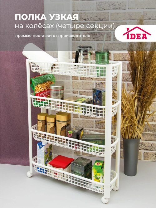 Этажерка Idea узкая на колесах с 4 секциями - отличное решение для организации хранения в доме или офисе. Узкий дизайн этой этажерки позволяет использовать ее в небольших помещениях, а колеса обеспечивают легкость перемещения.