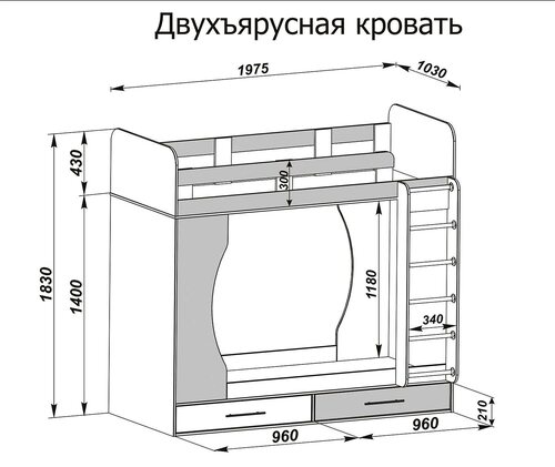 Двухъярусная кровать Юниор 2 Подробный чертеж с размерами